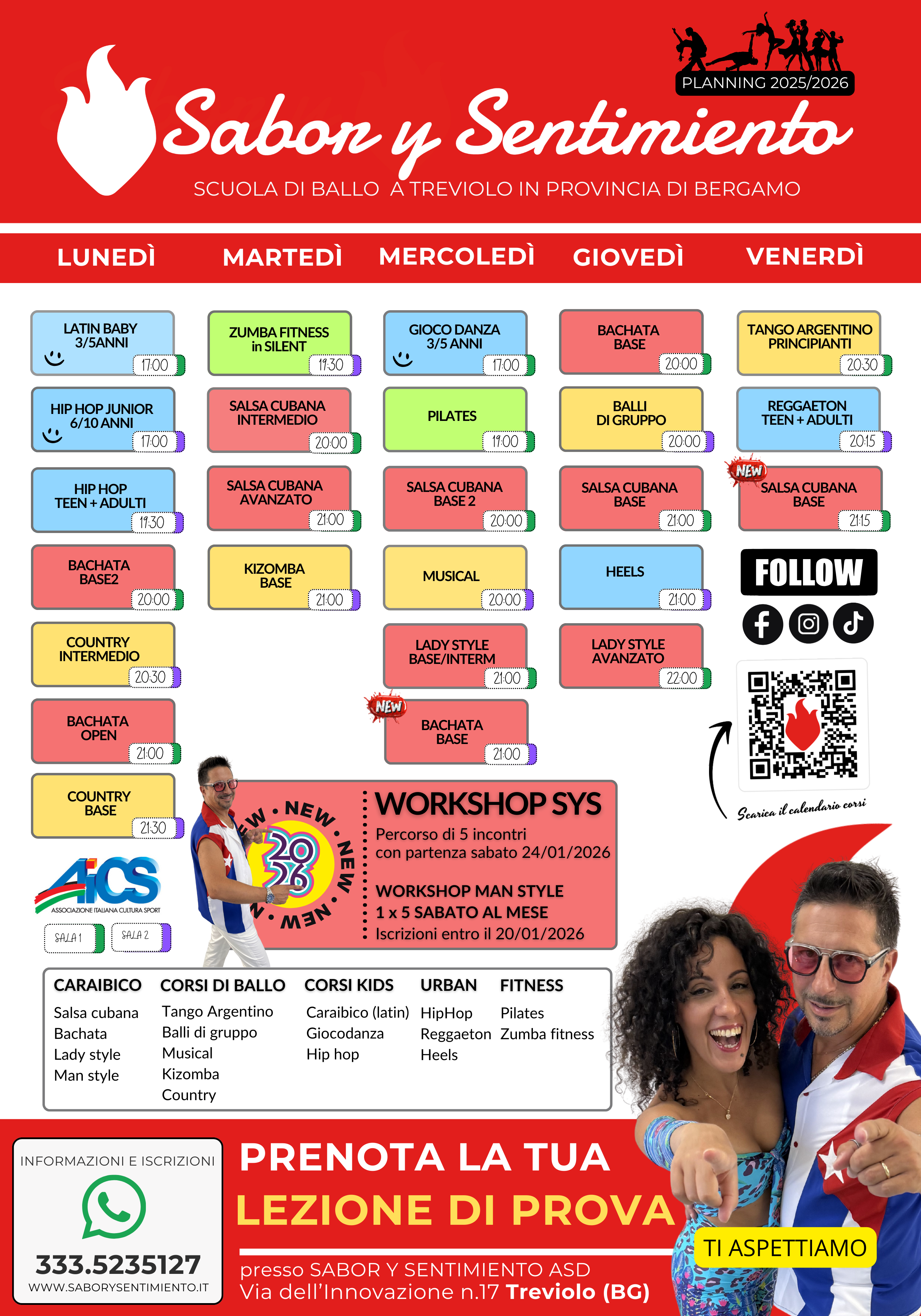 Salsa cubana, Bachata, Tango argentino, Hip Hop, Reggaeton, Musical, Kizomba, Zumba fintess in silent, Pilates, Lady style, Workshop Man Style, Balli di gruppo, Heels, Country, Latin baby e Giocodanza per i più piccini.